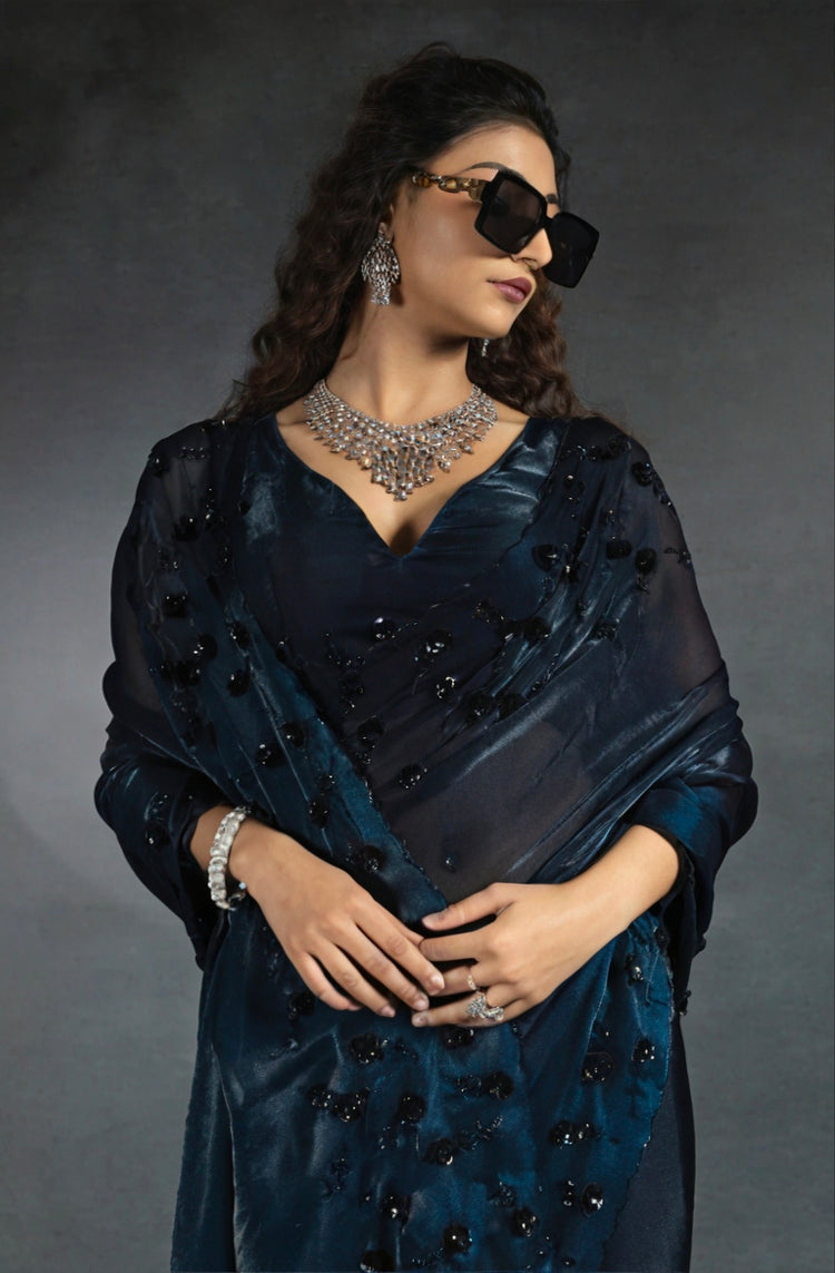 Make an unforgettable entrance at your next celebration with our exquisite Deep Teal Satin Fendi Saree. This stunning saree, featuring intricate stone handwork and a luxurious sheen, is designed to elevate your party wear and make you the center of attention.