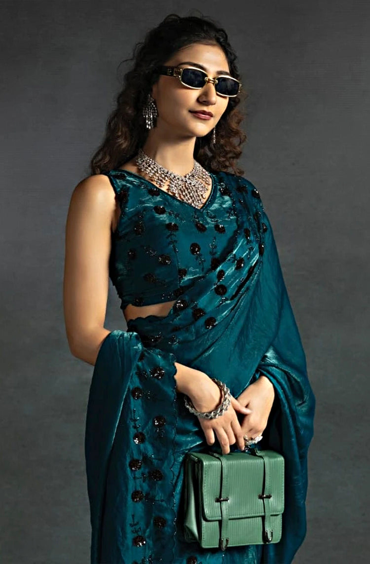 Teal Satin Fendi Saree with Handcrafted Sequence Work