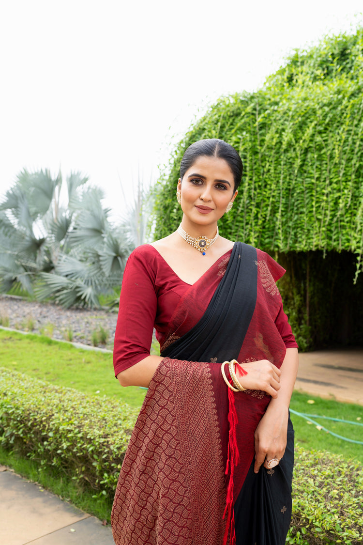 - Elegant Design: The saree features a captivating combination of black and red, adorned with intricate jacquard patterns that reflect traditional artistry while adding a modern touch.